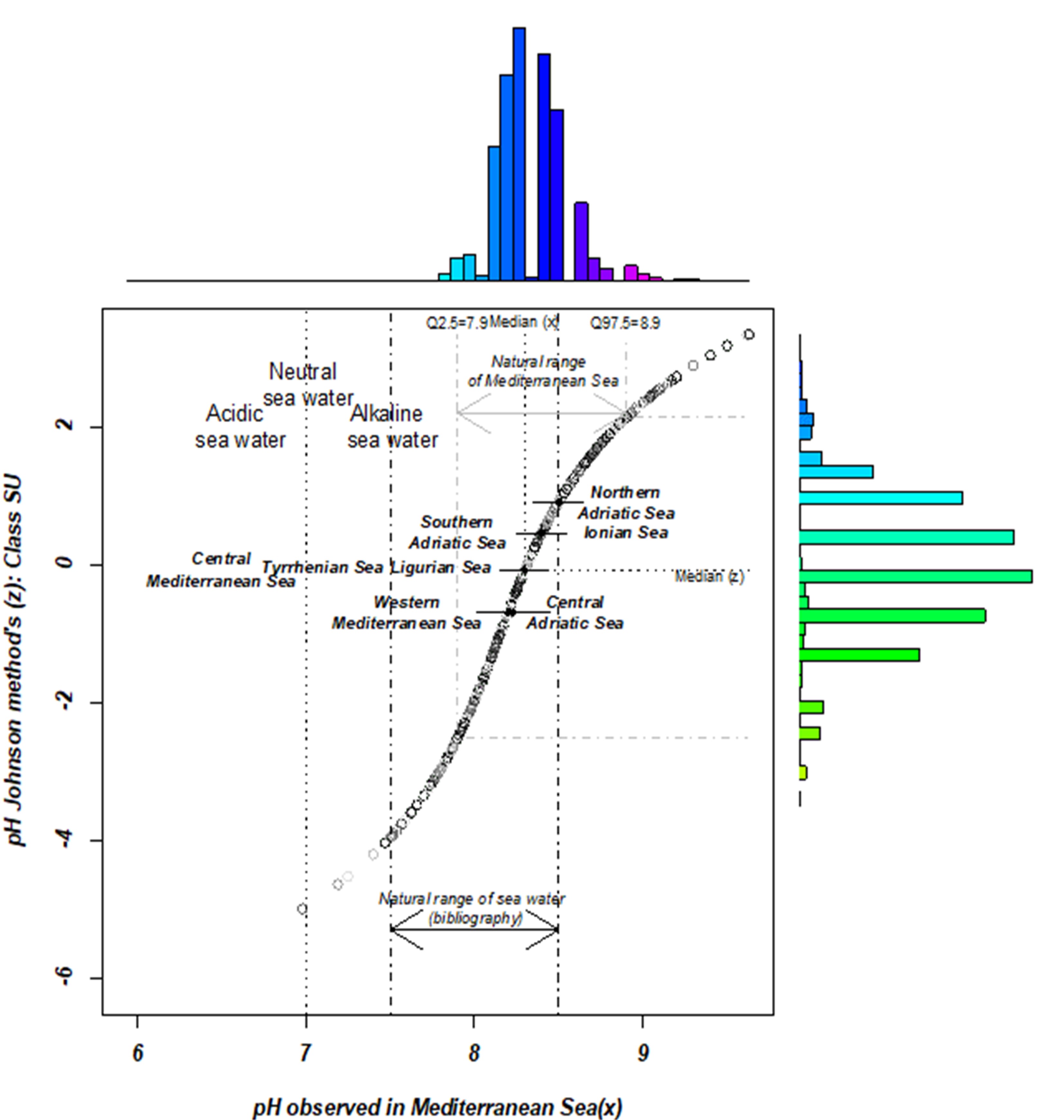 I valori del pH superficiale (z < 25 m) (MSFD) sono stati analizzati per ciascuno degli 8 sottobacini per identificare la distribuzione statistica e assegnare le distribuzioni di frequenza appropriate. Ogni distribuzione del campione è stata analizzata e definita da una funzione di probabilità di densità (Metodo di Johnson).
