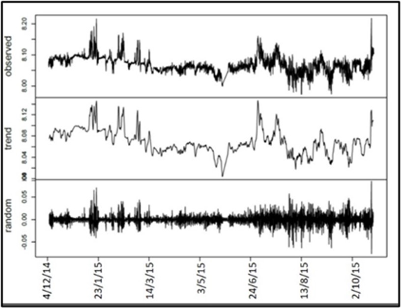 Fig. 3 – Decomposizione della serie storica delle registrazioni del pHTot misurate dalla sonda dal 03.12.2014 al 14.11.2015. Pannello superiore: registrazioni del pH totale osservato; Inferiore: andamento dei valori pHTot; più in basso: residui.