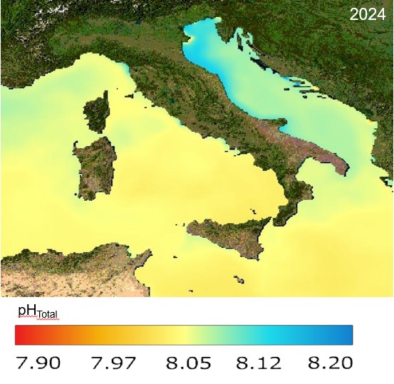 I dati annuali CMEMS (Fig. 4) confermano il trend di maggior rischio di acidificazione del Mar Mediterraneo Occidentale nel 2023 e nel 2024 con valori minimi di 7.97.