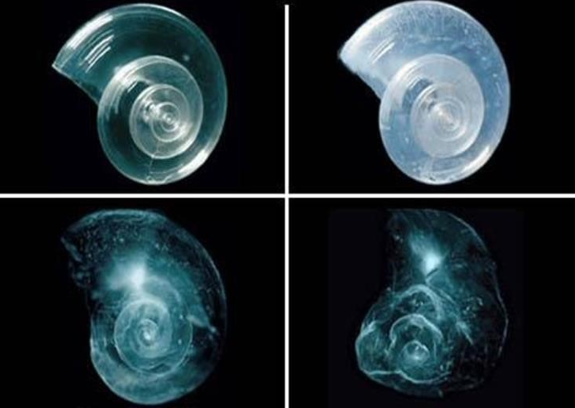 Esperimento in laboratorio: una conchiglia di Pteropode in acque con acidità crescente si dissolve in 45 giorni. Fonte: Courtsey of David Littschawger/National Geographic Society.