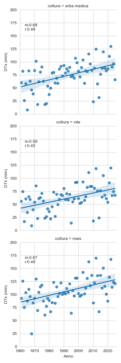Tutte le tendenze indicano un aumento statisticamente significativo del valore massimo annuale del deficit traspirativo cumulato negli ultimi 65 anni (1961-2025), ad indicare un incremento della siccità agricola, a breve (30 giorni) e medio termine (90 giorni). Gli incrementi sono tra 6 e 7 mm/decennio sui 30 giorni, e tra 17 e 20 mm/decennio sui 90 giorni. Il mais appare come la coltura con incrementi di deficit più alti, la vite quella con gli incrementi minori.