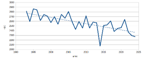 I dati del periodo 1993-2024 (Fig.1) evidenziano un trend, statisticamente significativo, di diminuzione del fabbisogno di riscaldamento. Tale andamento è presente sull’intero territorio regionale. Utilizzando le proiezioni climatiche si osserva che tale tendenza è destinata ad aumentare nel futuro. Da notare la differenza a fine secolo tra i valori di HDD per lo scenario RCP4.5 e RCP8.5, quest’ultimo caratterizzato da riduzioni dell’indicatore di circa il -30%.