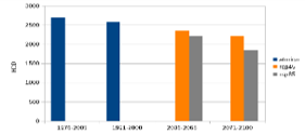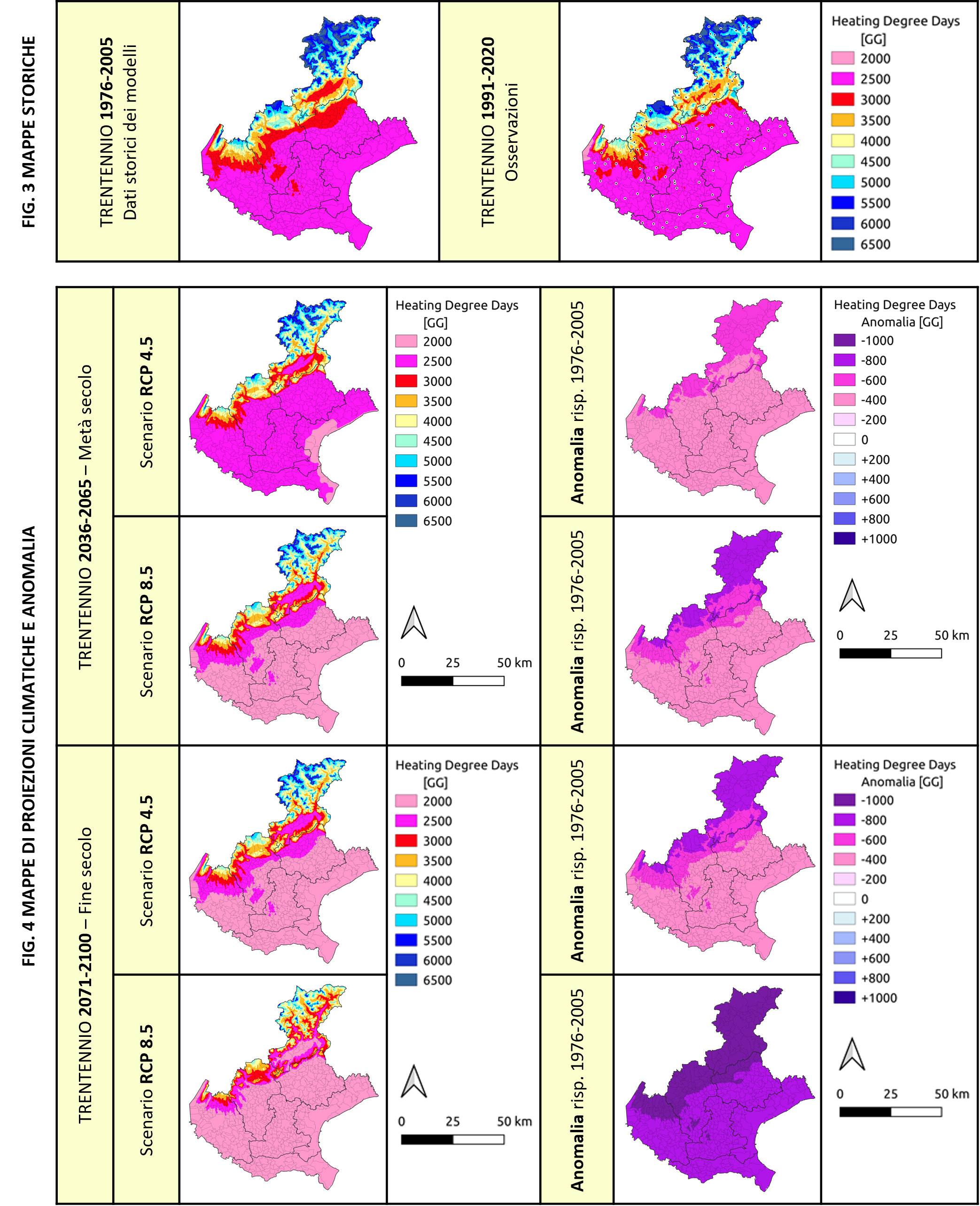Nelle figure 3 e 4 sono rappresentate rispettivamente  le mappe storiche e le proiezioni climatiche con i valori dell’indicatore espressi in termini assoluti e di anomalia