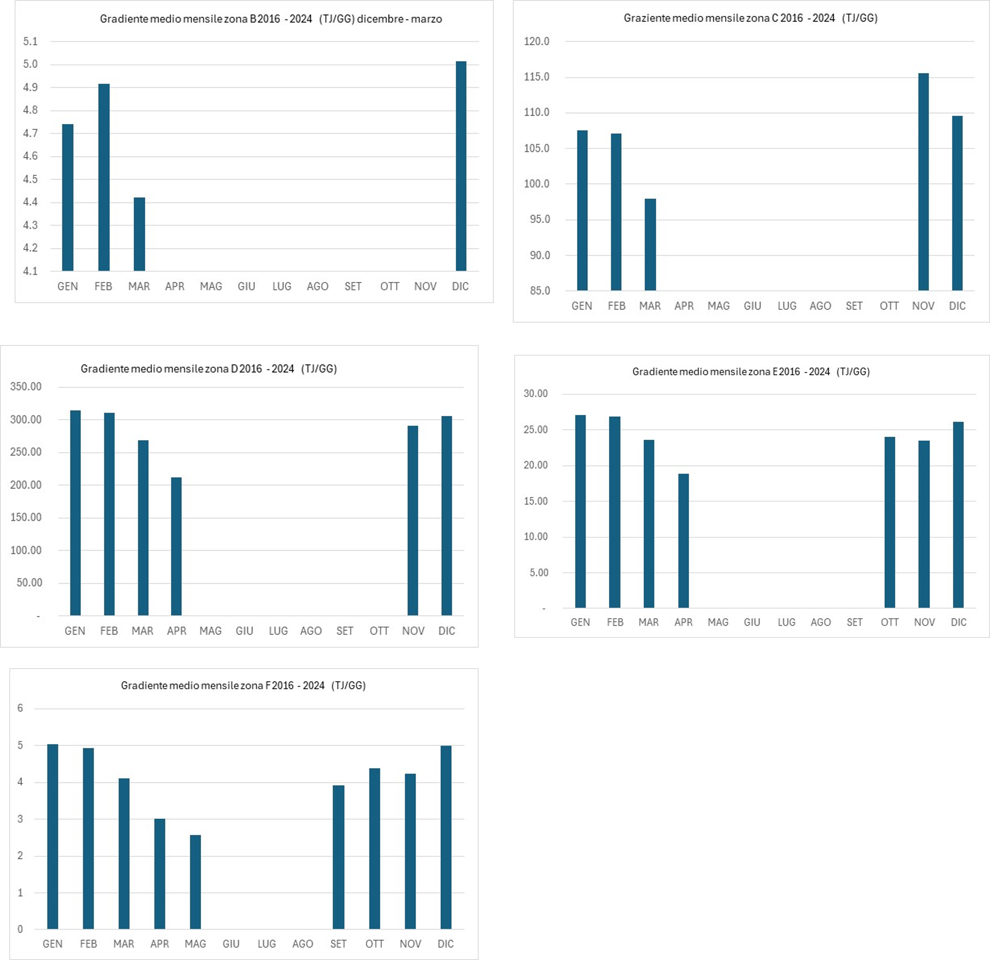 Dalla Figure 2, Il gradiente medio mensile sul periodo temporale 2016 – 2024 per ciascuna zona climatica segue un andamento stagionale, con i valori massimi concentrati nei mesi più freddi del periodo di riscaldamento. Questo trend risulta particolarmente evidente nelle zone caratterizzate da un clima più rigido.