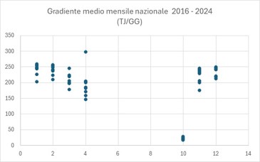 Dal grafico in Figura 1 e dalla Tabella 1 emerge che, negli ultimi nove anni, il gradiente di consumo stimato assume un valor medio stagionale a livello nazionale pari a 195 TJ/GG, con un andamento che nel corso dell’inverno mostra il suo massimo nei mesi più freddi raggiungendo i 242 TJ/GG nel mese di gennaio. A livello annuale, il valore più elevato del gradiente si riscontra nel 2018, anno contraddistinto da un’anomalia termica complessivamente negativa. Al contrario, il valore minimo di 167 TJ/GG si registra nell’inverno 2023 che è stato caratterizzato da temperature particolarmente miti.