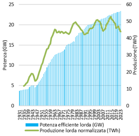 Nel periodo 1935-1963 la capacità installata presenta un incremento costante e la produzione idroelettrica segue un andamento parallelo. Successivamente si osservano andamenti ciclici intorno a un valore medio della produzione elettrica con un trend in crescita (pari a oltre il 10%). A fronte di un aumento della potenza installata la produzione di energia idroelettrica non procede di pari passo, il rapporto tra la produzione e la stessa subisce un’evidente diminuzione, con un picco inferiore nel 2023 pari a 43.8. La produzione idroelettrica è stata per lungo tempo la principale fonte di energia elettrica rinnovabile per il nostro Paese. Oggi copre circa il 15-17% della produzione elettrica nazionale e il 34,8% della produzione rinnovabile. La potenza disponibile è aumentata dal 1935 di un fattore 5,87 a fronte di un incremento della produzione di un fattore 3,13.