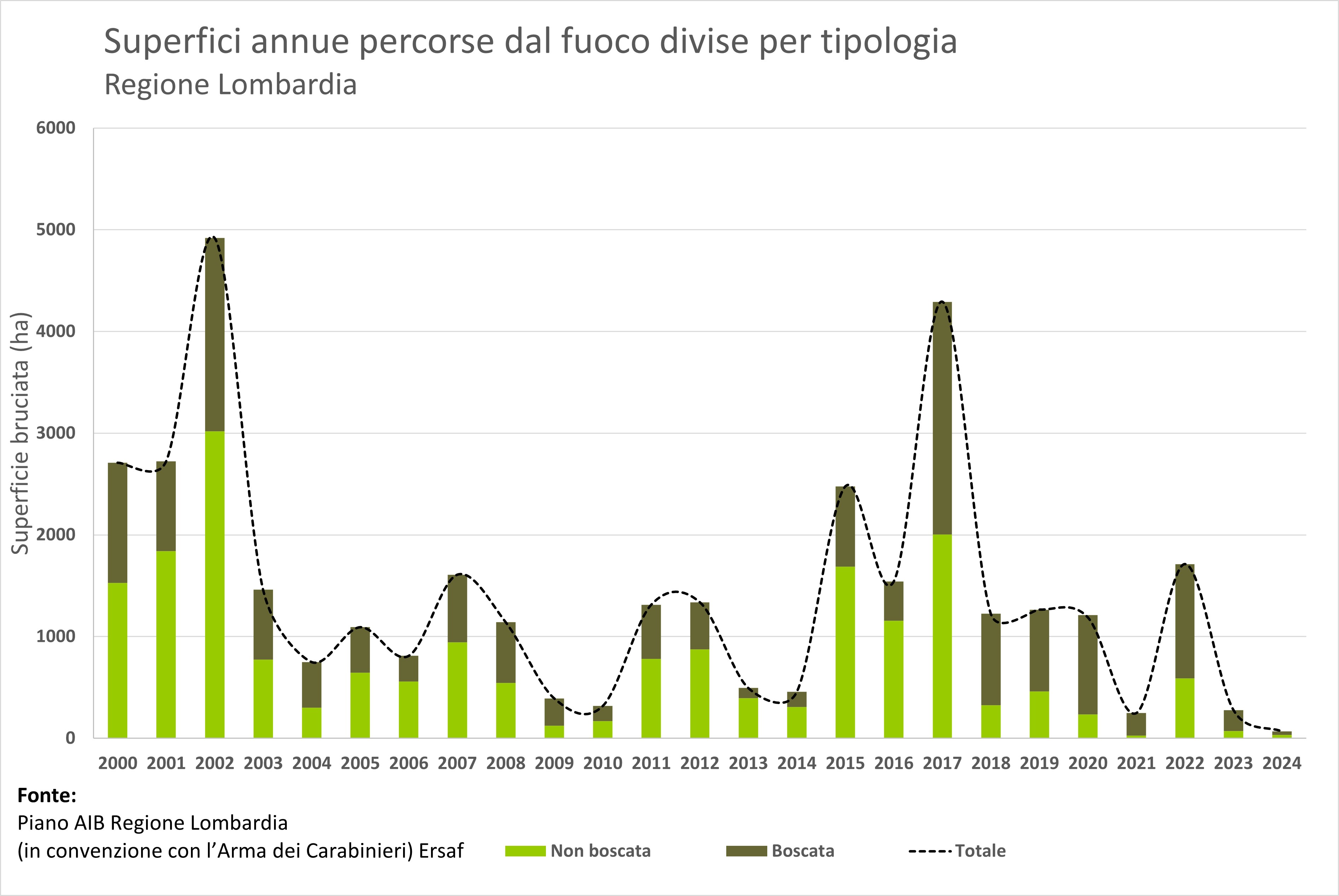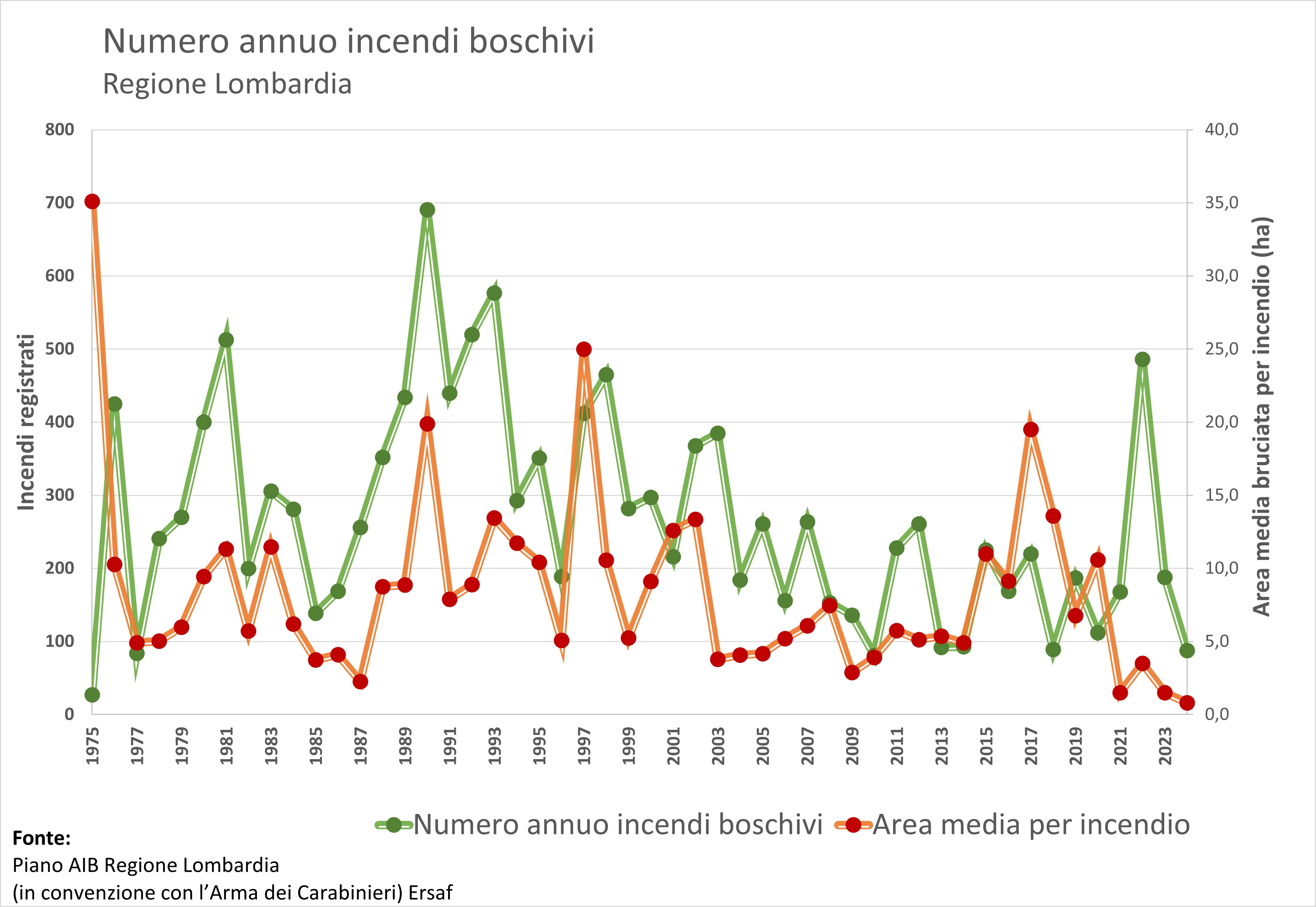 L’indicatore presenta la serie storica (1975-2024) dell’andamento degli incendi forestali in Lombardia, attraverso i valori annui di superficie (boscata e non boscata) percorsa dal fuoco e il numero di incendi.