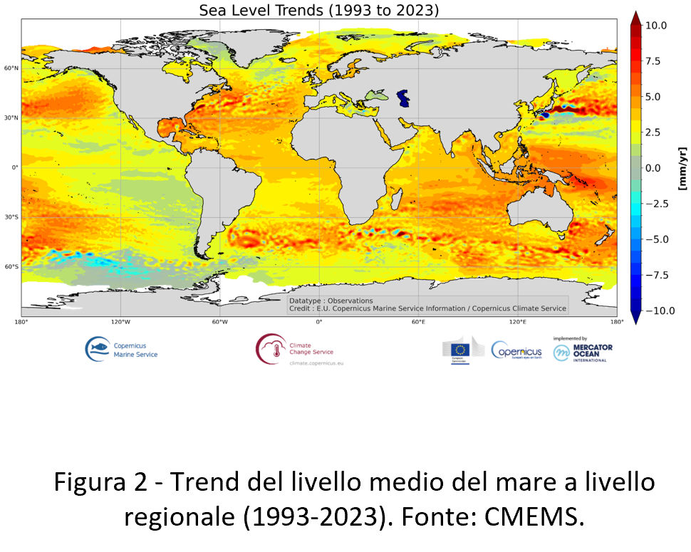 - Fonte e accessibilità dei dati di base: Copernicus Marine Environment Monitoring Service (CMEMS) Ocean Monitoring Indicators. Prodotto di riferimento: Map of the altimeter regional sea level trends (GLOBAL_OMI_SL_regional trends).