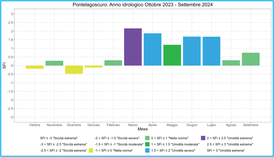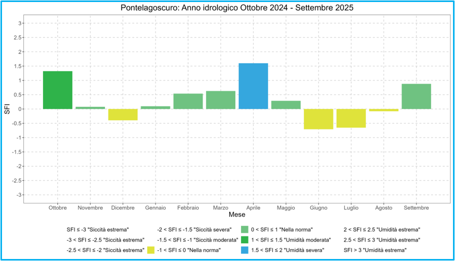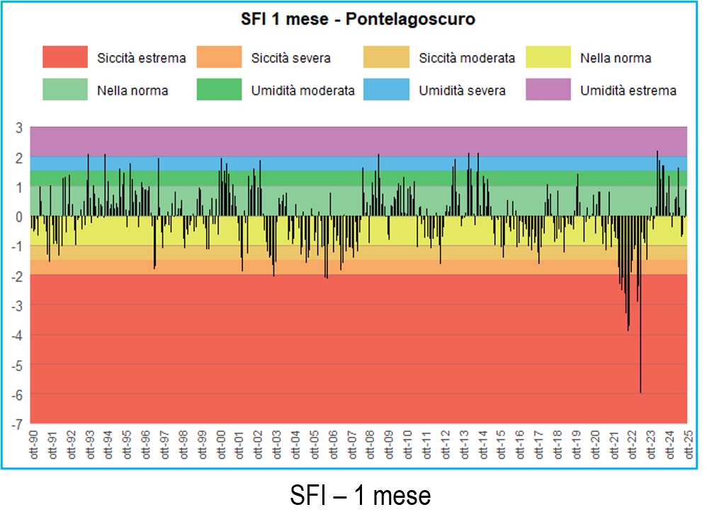 L’indice SFI calcolato per le principali sezioni del fiume Po (Piacenza, Cremona, Boretto, Borgoforte e Pontelagoscuro), calibrato con i dati del trentennio 1991-2020, ha identificato per l’intero anno idrologico 2023-2024 condizioni idrologiche di “nella norma”, “umidità moderata”, “umidità severa” finanche condizioni di “umidità estrema” osservate durante il mese di marzo. Anche durante il successivo anno idrologico, ovvero 2024-2025, i valori dell’indice non hanno fatto osservare particolari condizioni di siccità da un punto di vista dei deflussi transitanti nel fiume Po, rientrando infatti all’interno degli intervalli che identificano condizioni di “nella norma”, “umidità moderata” e “umidità severa” .