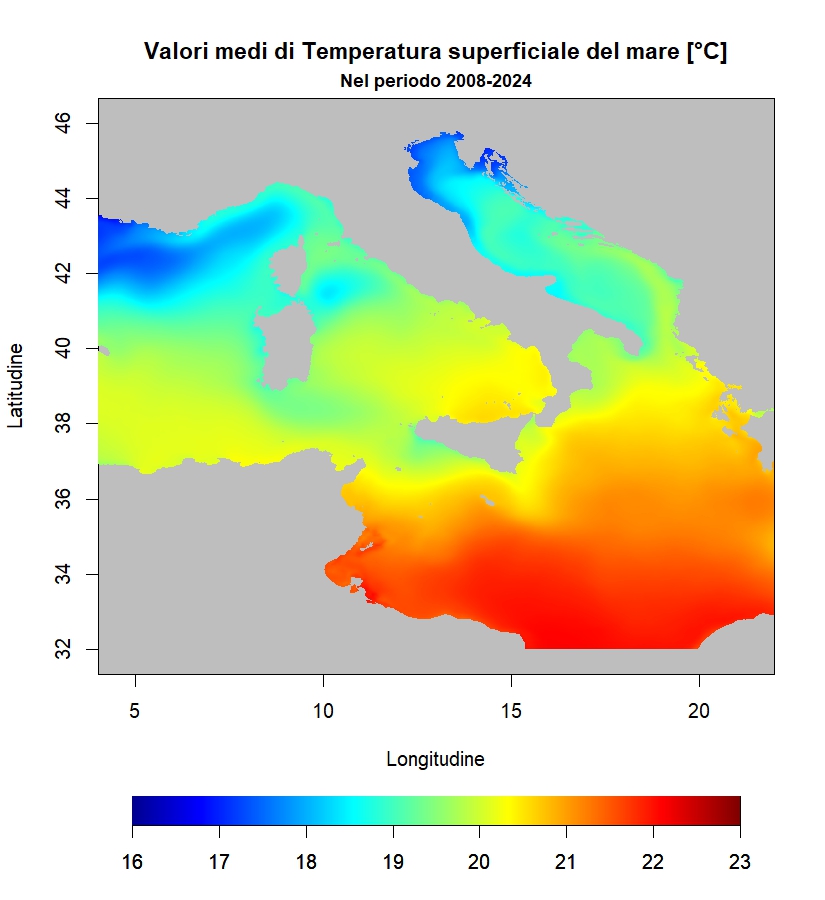 I valori medi di temperatura superficiale del mare (Fig. 1) sono chiaramente influenzati dalla latitudine. La particolare conformazione delle coste e gli apporti fluviali determinano condizioni locali favorevoli alla formazione di aree a temperatura più calda, come ad esempio nel Tirreno meridionale, o più fredda nel caso del nord Adriatico, influenzato dai fiumi padani. Le variazioni annue di temperatura superficiale del mare (Fig. 2) mostrano incrementi in tutti i mari italiani, con alterazioni marcate nel Mar Ligure, Adriatico e Ionio Settentrionale e valori attenuati alle basse latitudini. In Adriatico e nel mar Ligure si riscontrano i valori maggiori che superano i 0.08°C/anno.