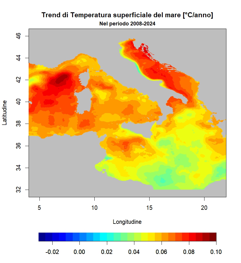 I dati giornalieri ricavati dalla piattaforma Copernicus sono valori di temperature superficiale del mare basati su immagini notturne di diversi sensori ad infrarosso montati su differenti piattaforme satellitari. Il dato viene estrapolato su una griglia a risoluzione spinta (<0.01° lat/lon) e copre i mari europei meridionali. Per ogni punto del grigliato viene calcolato il trend nel periodo 2008-2024.